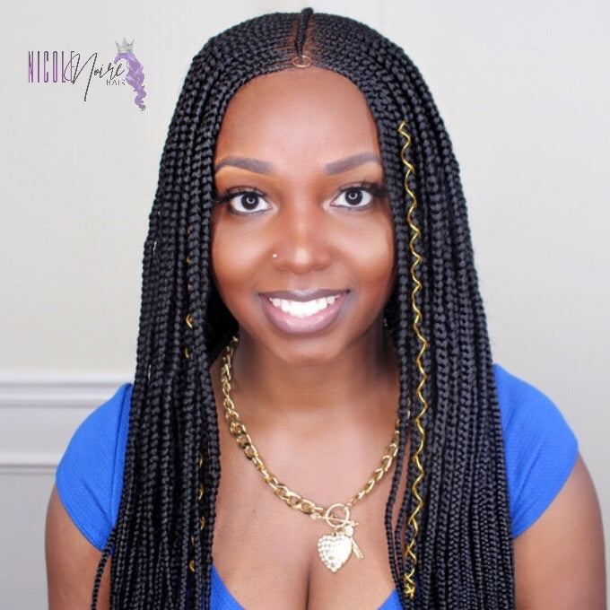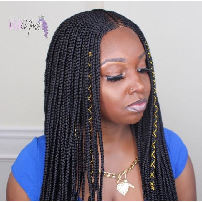 Save hours at the salon and get beautiful braids in minutes with this unit. Ashanti is a beautiful, hand braided, layered cornrow lace front wig. This wig comes with pre-bleached knots and baby hairs (baby hairs were removed in photo).